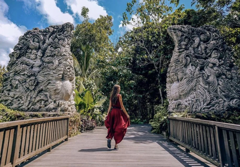 Select a tour with a transfer and relax on the drive to the Sacred Monkey Forest Sanctuary in an air-conditioned car. Meet your local guide at the main entrance and walk by a pond with a colorful collection of Koi fish before passing the through decorative gate where there is a group of macaques.